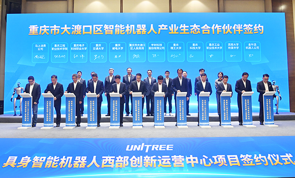 当日,宇树科技与大渡口区相关院校、科研机构、企业等签署智能机器人产业生态合作协议,各方将携手共建“产学研用金”全生态伙伴关系,打造互利共赢、协同共进的智能机器人产业生态集群。